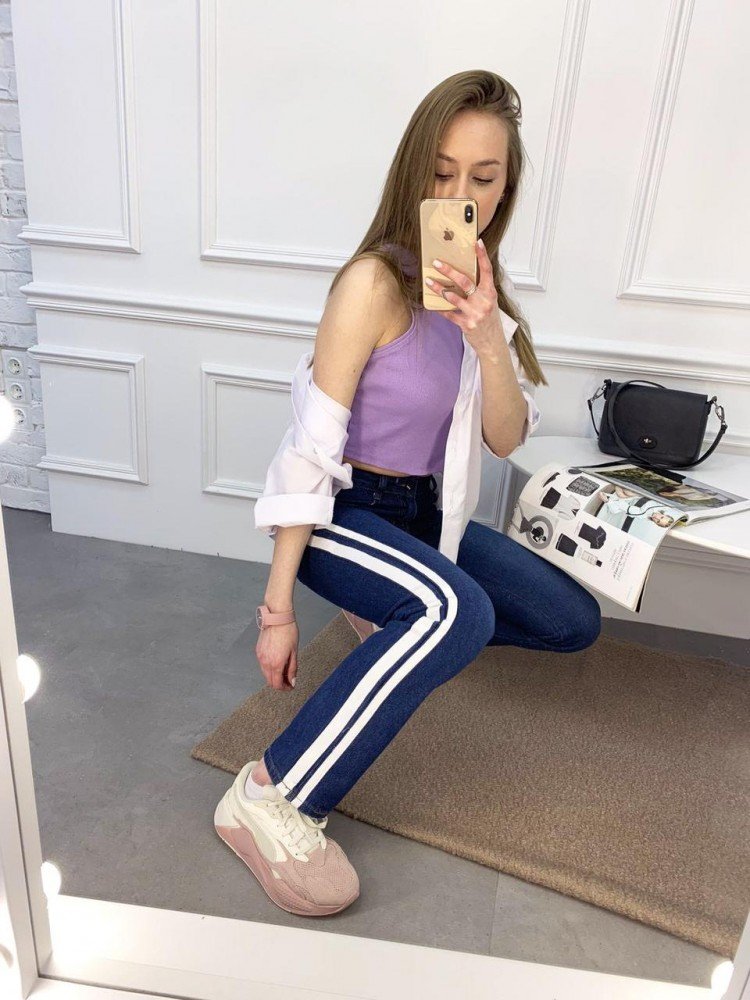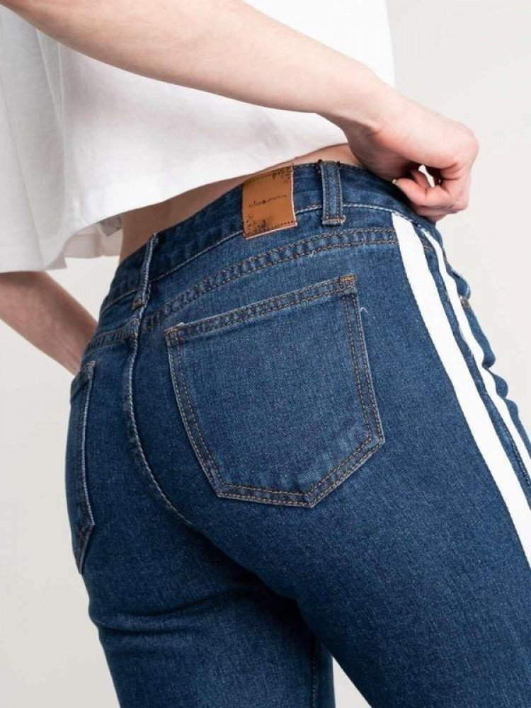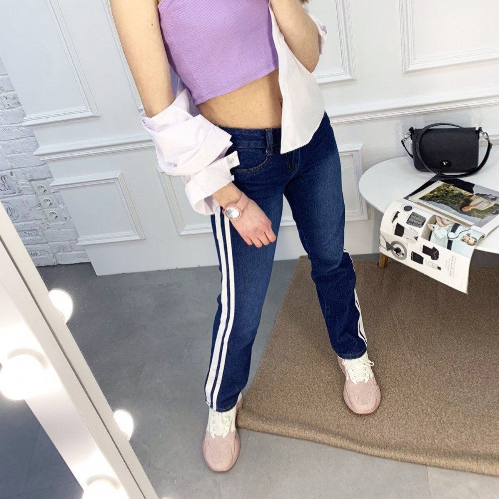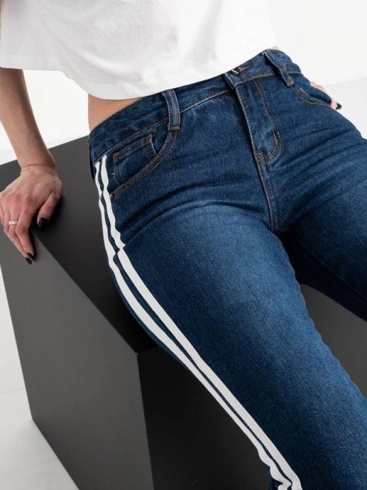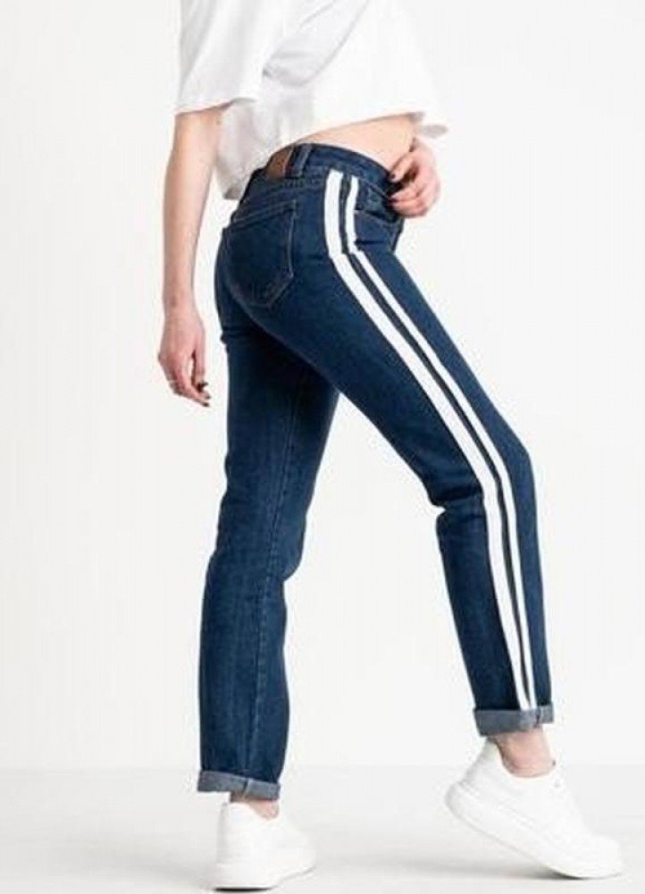 Женские джинсы в спортивном стиле с белыми лампасами по бокам.