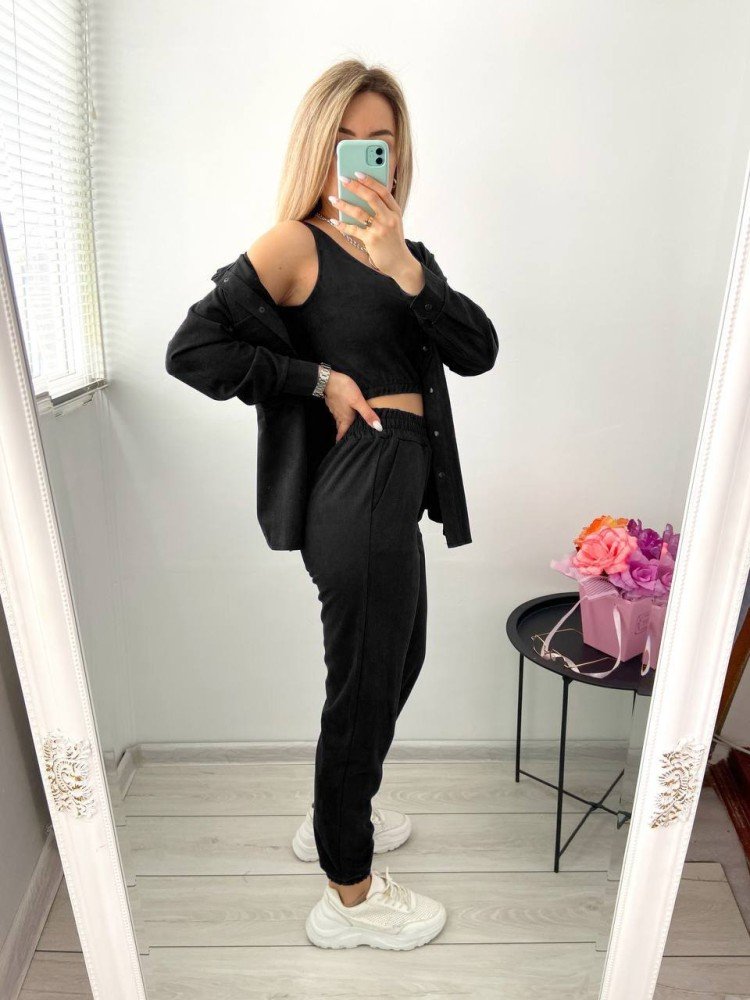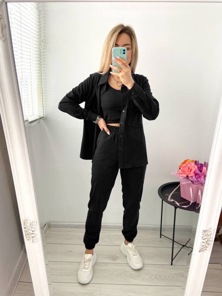 Женский стильный костюм рубашка штаны и топ (комплект), черный
