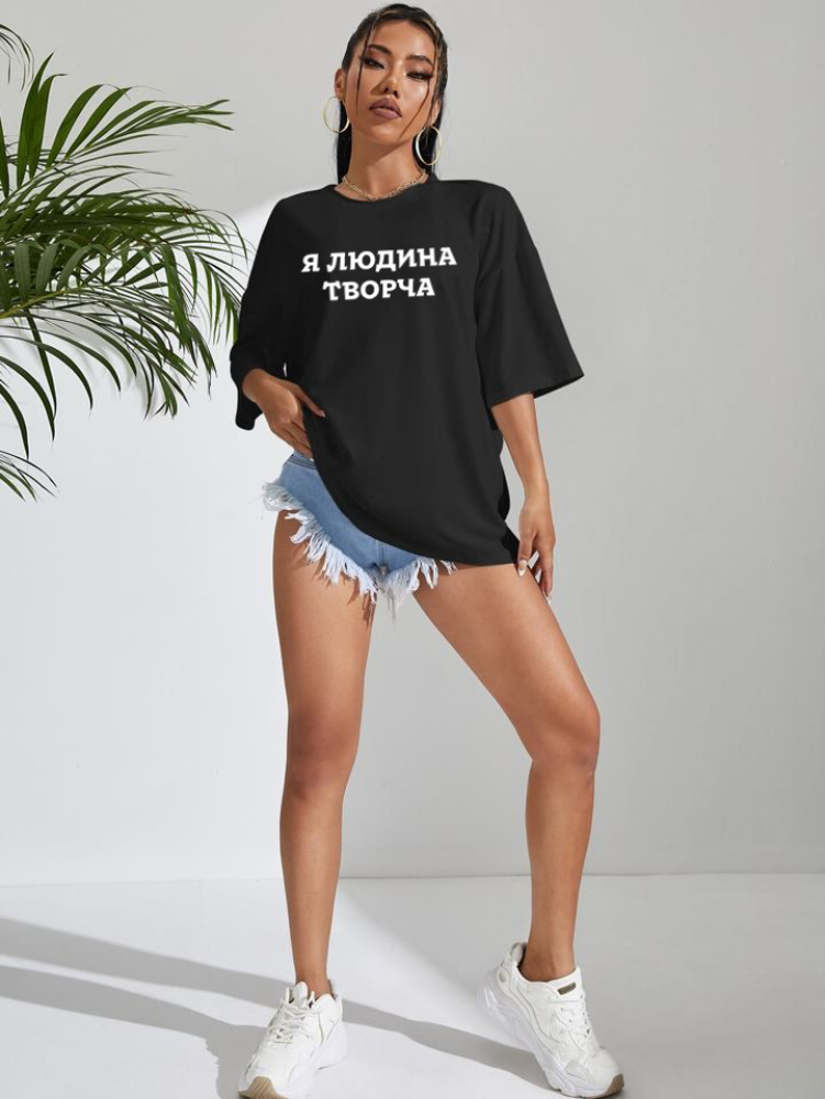 Жіноча чорна модна оверсайз футболка з трендовим принтом вражаючий союз ультрасучасних модних тенденцій і максимально можливого рівня зручності в дні, що палять
