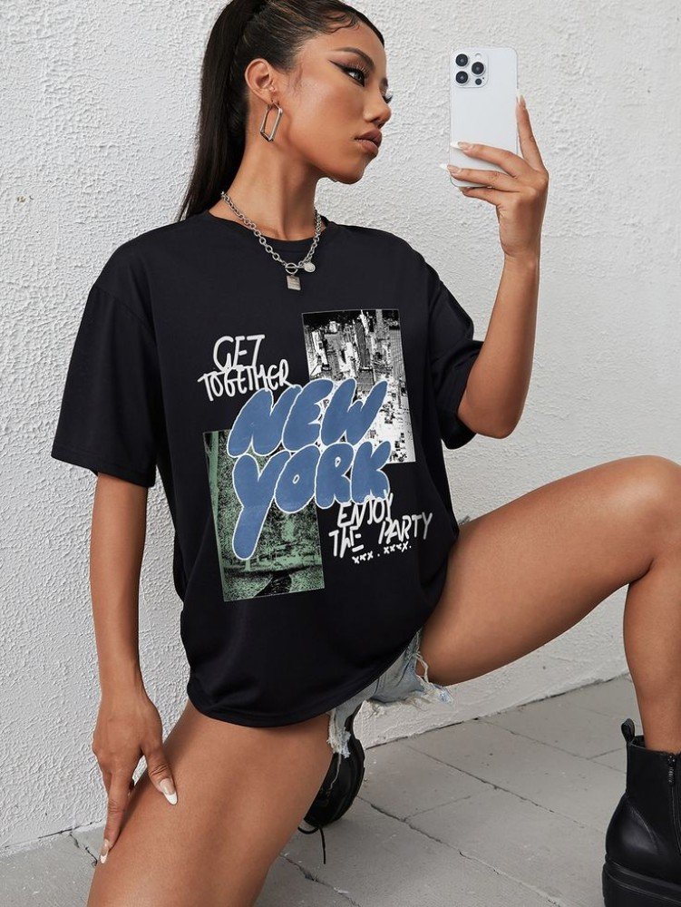 Чорна зручна жіноча оверсайз футболка з трендовим принтом вражаючий союз ультрасучасних модних тенденцій і максимально можливого рівня зручності в дні, що палять