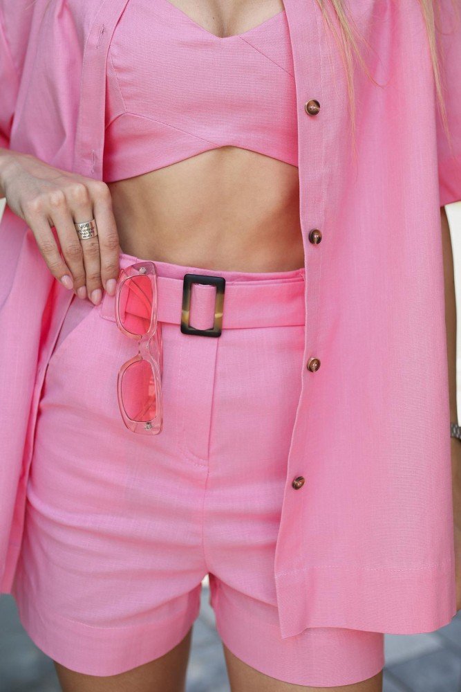 В комплект входить: сорочка з коротким рукавом, топ та шорти з поясом.