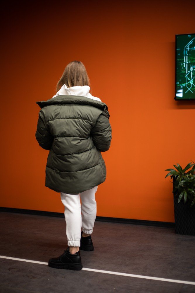– Капюшон съемный. Остаётся высокая стойка, закрывающая горло;