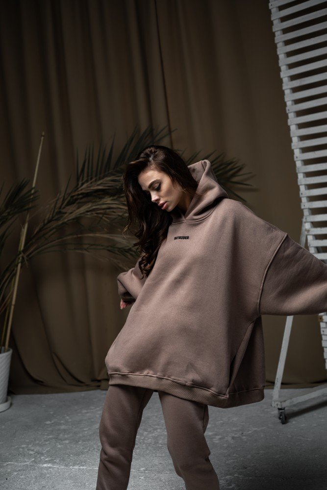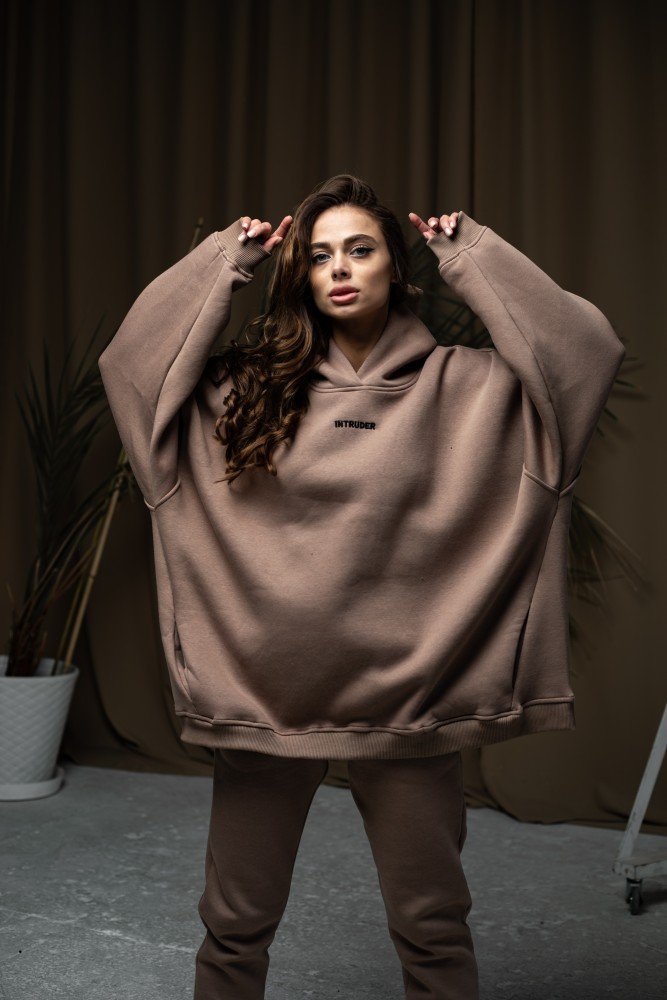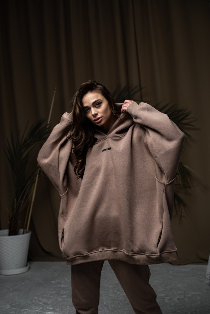– вільна модель із заниженою лінією плеча та подвійним, глибоким каптуром;